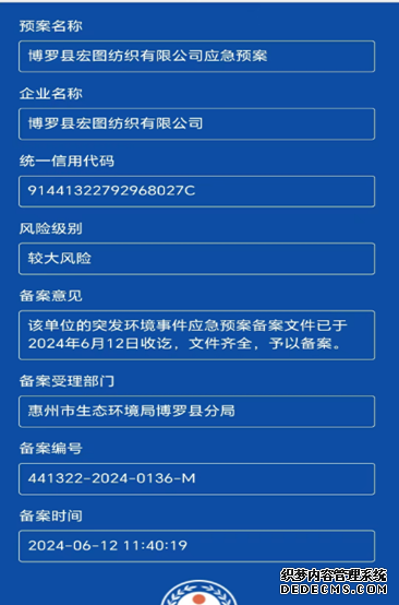 已制訂《博羅縣宏圖紡織有限公司環(huán)境風(fēng)險評估報告》,并于2017年10月25日上報博羅縣環(huán)境保護局備案; 2021年和2024年在惠州市生態(tài)環(huán)境局博羅分局進行再次備案 |