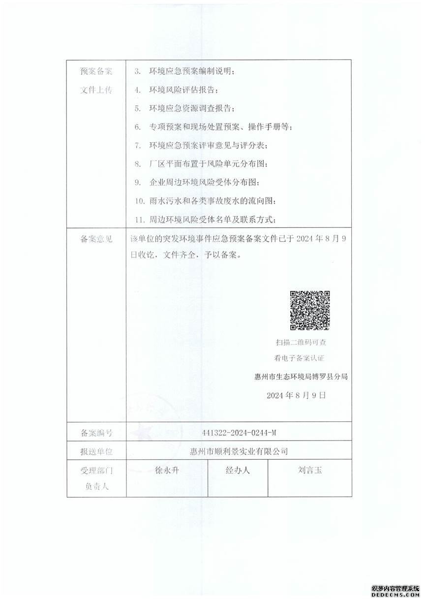 已制訂《惠州市順利景實業(yè)有限公司突發(fā)環(huán)境事件應(yīng)急預(yù)案》,并于2024年 8月9日在博羅縣環(huán)境保護局備案, 備案編號:441322-2024-0244-M |